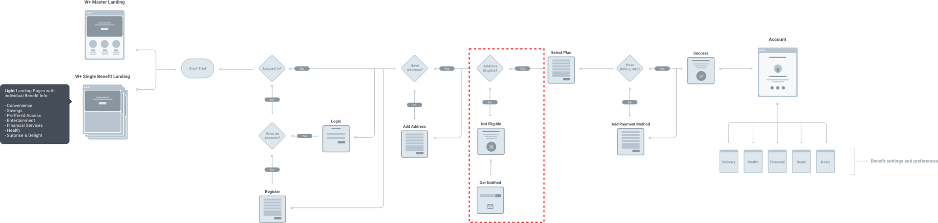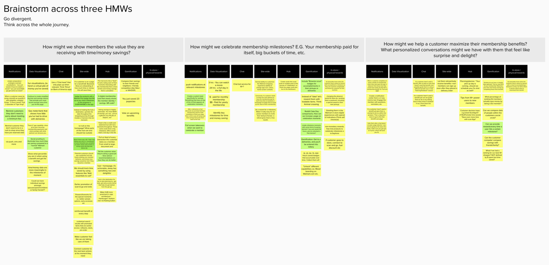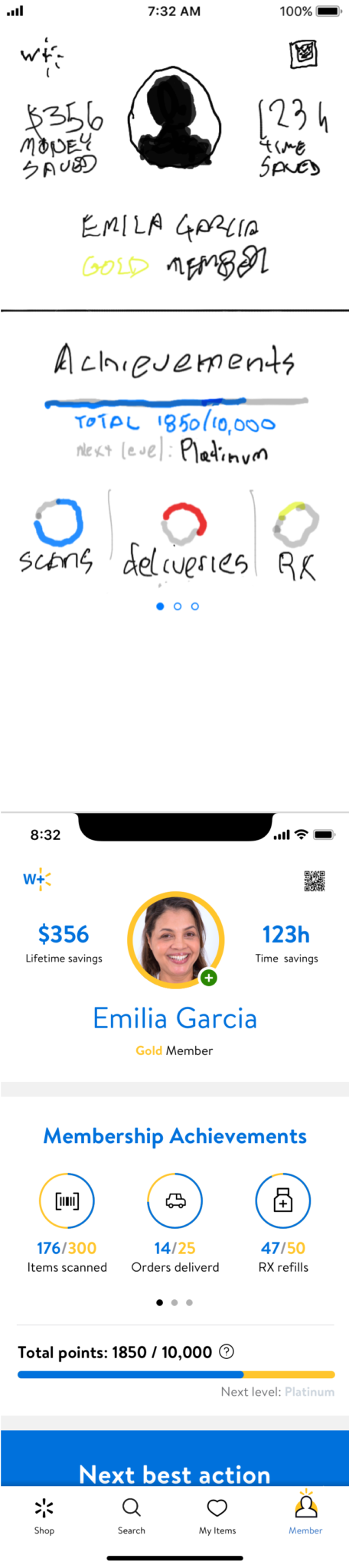 At this point, we started getting actual requirements, we had plenty of ideations to share, and things were getting buttoned up. We took a side step to look at how the whole W+ account navigation could work; I led team brainstorms around user flows and subsequent best actions and celebration moments, which created some excellent output!