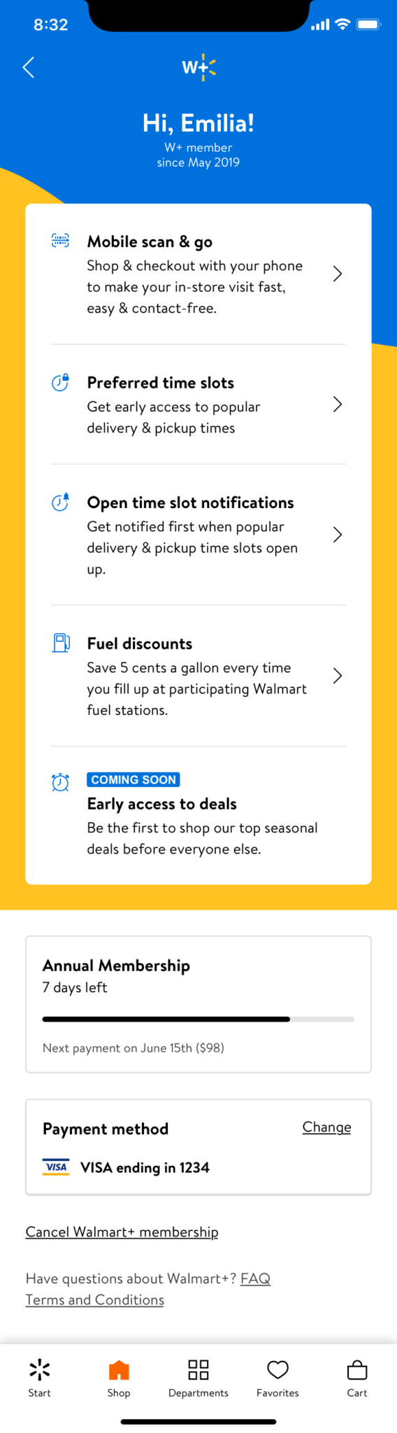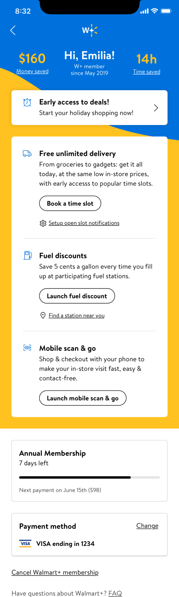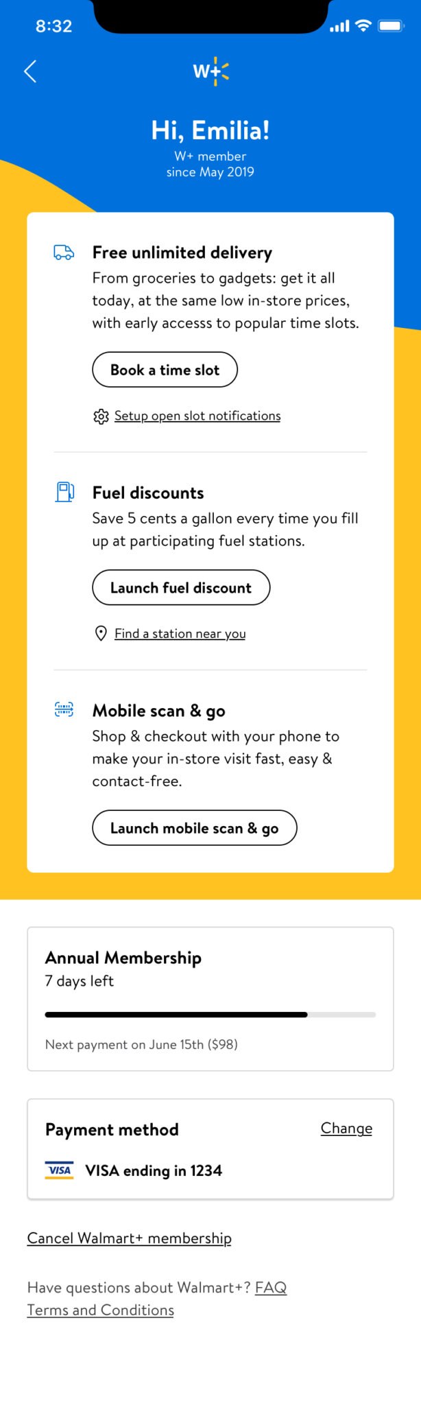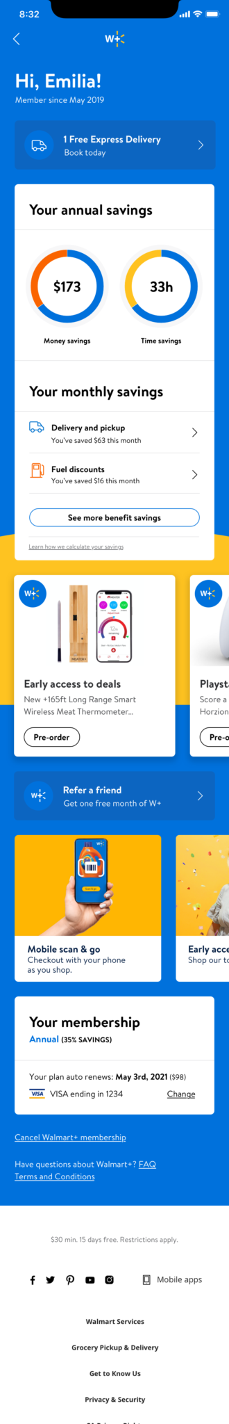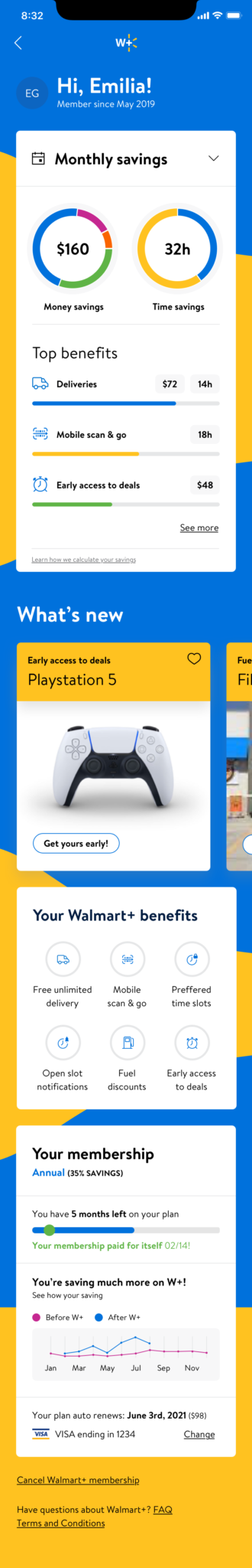 Create a premium Walmart subscription membership account page for Walmart+