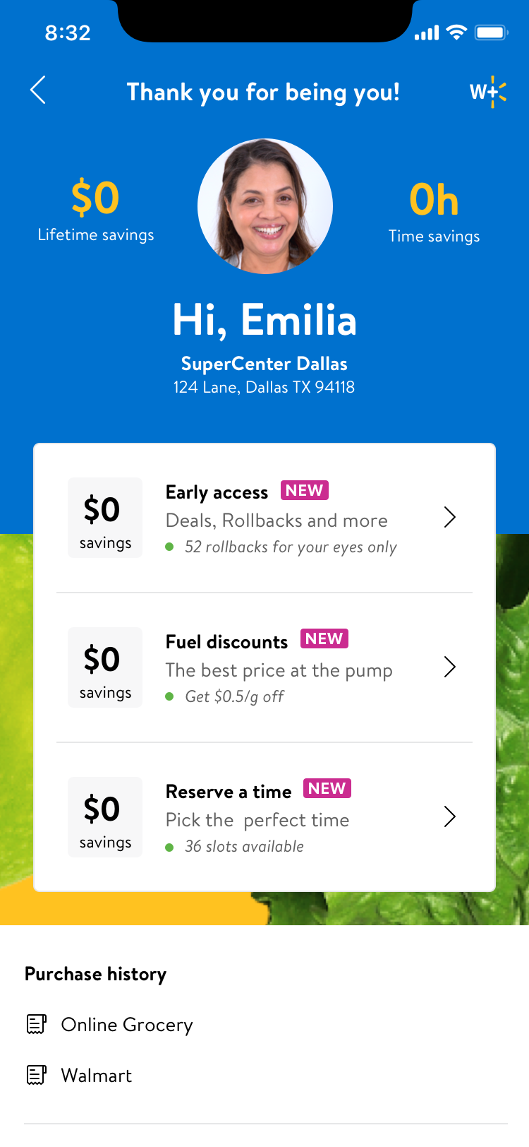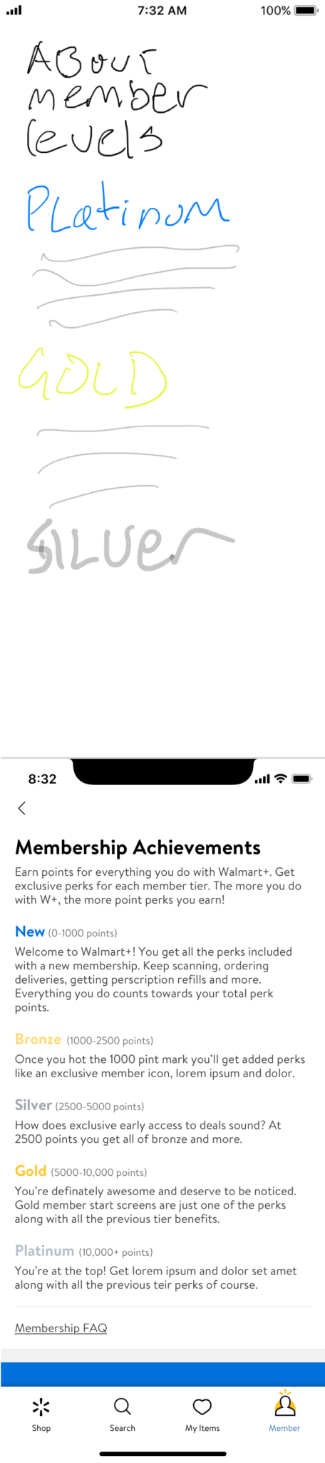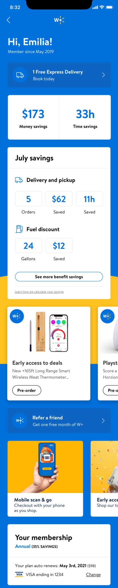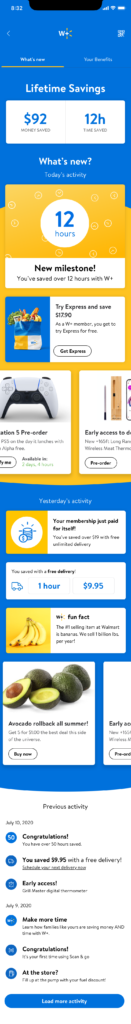 With Covid-19 impacting everything everywhere, the shopping needs of Walmart customers were rapidly changing. More and more people were utilizing services like contactless checkout (Scan&Go) and pick-up and delivery. Walmart had an existing program called Delivery Unlimited (DU); for a small monthly fee, a subscriber would get free delivery, but this wasn’t meeting the consumer’s or the company’s needs. There was a significant increase in usage of these tools, and Walmart wanted to look to the future and create even better ways to serve customers with a new subscription-based membership program. This premium service would need to offer continually adapting benefits and perks in addition to tools for shopping in this new world. The new service would be called Walmart+ and became the #1 priority for product teams. I was brought in on the project to help create the W+ dashboard. What does the “home” of W+ look like for customers? There were several problems to work through; is it part of the account? Is it its section, and if so, how does that compete with navigation within apps and on the web? What things would a W+ member want to see there? Is it savings? Is it a place for all things W+? is it just settings? These were the questions I had, and I got to work exploring them within a very rapid timeline.
